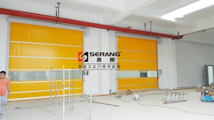 蘇州西朗門業生產的工業快速卷簾門安裝于江蘇鹽城工廠車間內,警示顏色門簾美觀大方牢固耐用: